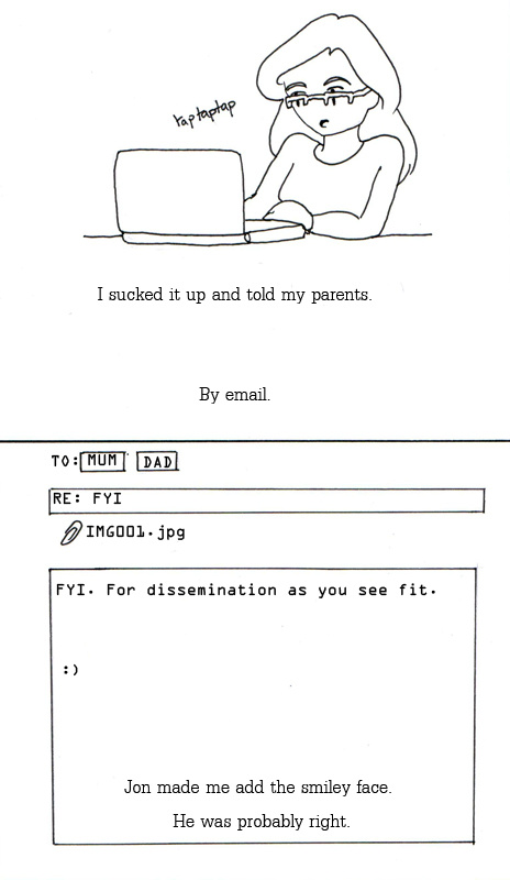 So I wrote an email! Mum had just got email, and found it super duper exciting. And Dad actually knew how to work it, so he could help Mum if she got stuck. They wouldn't mind that it was an email. And I'd avoid the awkward conversation.