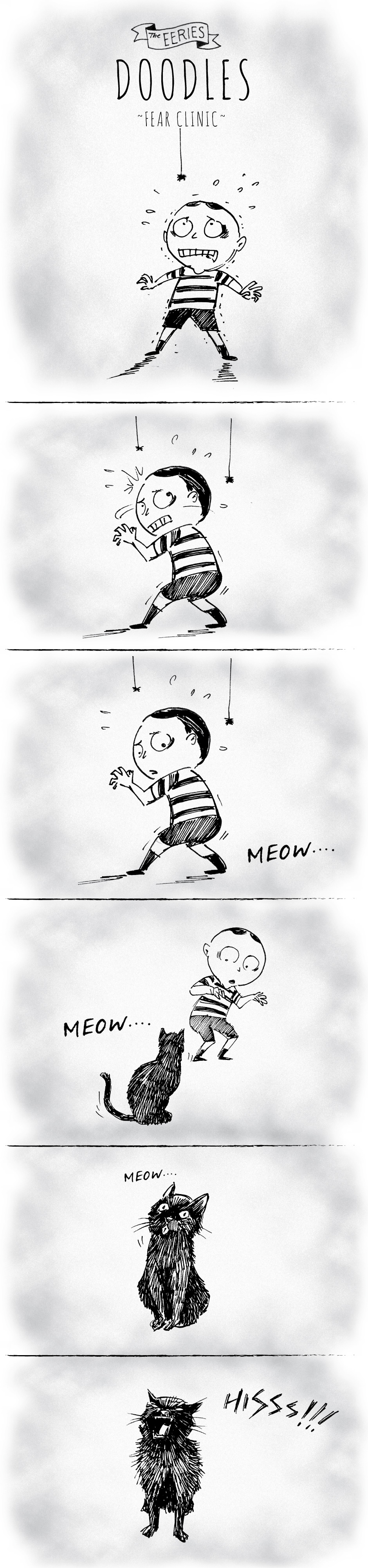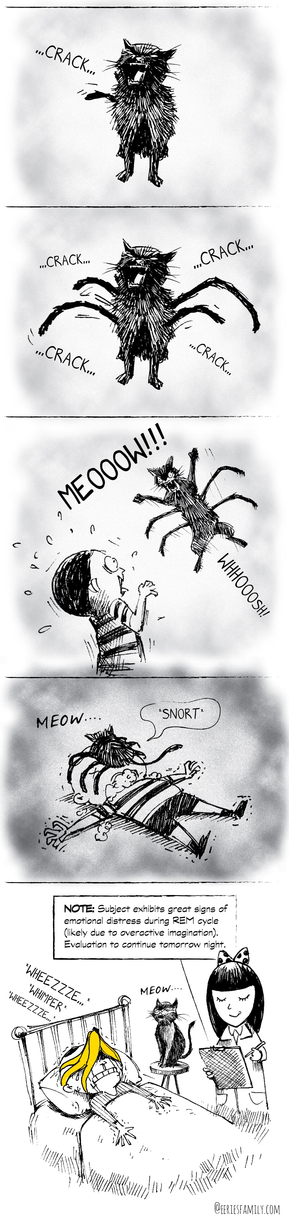 A quick doodle of a story. Meet Klara, Viktor, Baby Wick and POE, the black cat! Catch their shenanigans here on Sundays. Website: www.eeriesfamily.com