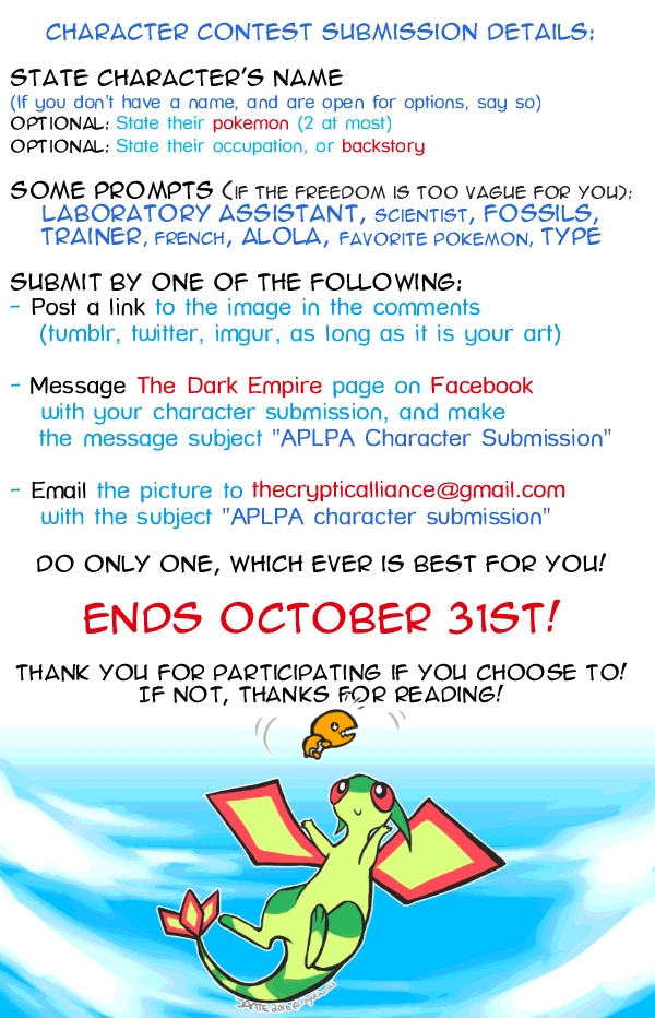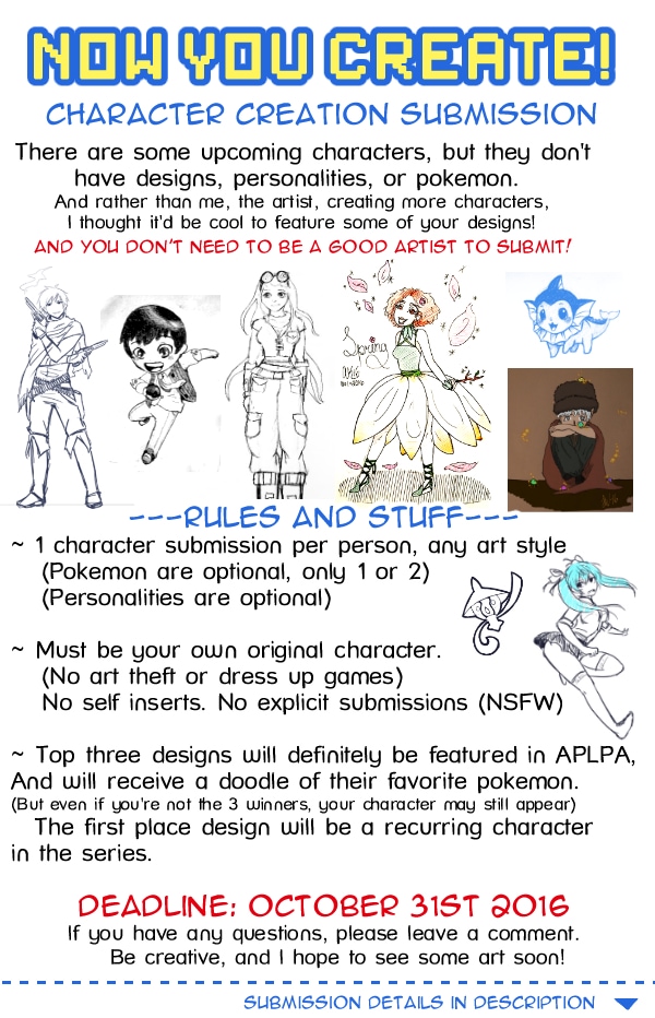 This is a interactive fanmade comedy comic of an adventure in the pokém*n universe (please don't sue me). The story events and choices are decided by the audience!