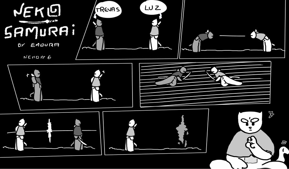 Excelente mensagem: o combate entre o o bem e o mal internos com a vitória do bem no final! Está bem bacana a diagramação das tiras! Gostei do nome Neko (gato em japonês). Tive um gato de nome Neneco e quase que esse foi o nome escolhido para o gato da turma do Marco e seus amigos que co-criei com o Tako. :)