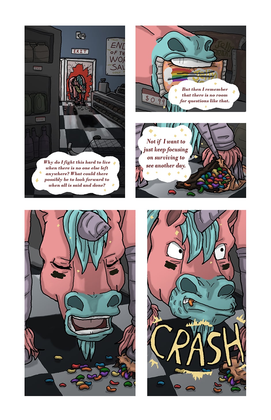 The heartwarming* tale of a unicorn fighting his way through the end of the world, fighting off zombies and making friends along the way. (*Note: This story is not heartwarming at all.) Updates every Saturday.