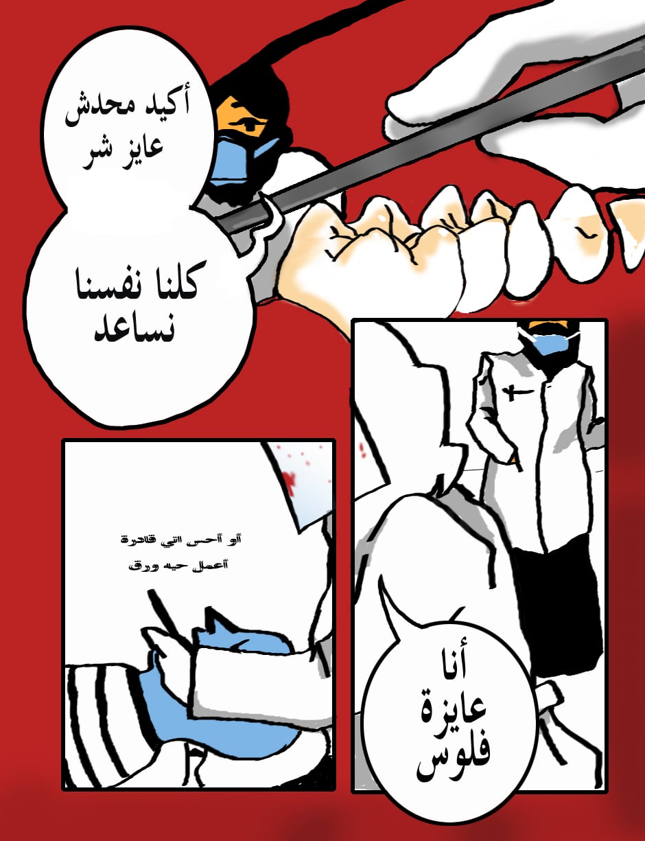 Translation: "No body wants evil...we all want to help" "I want money...or want to feel like I CAN make some paper..." YES there are niqabi dentists...No the patient is not dead...just blue....or is he?
