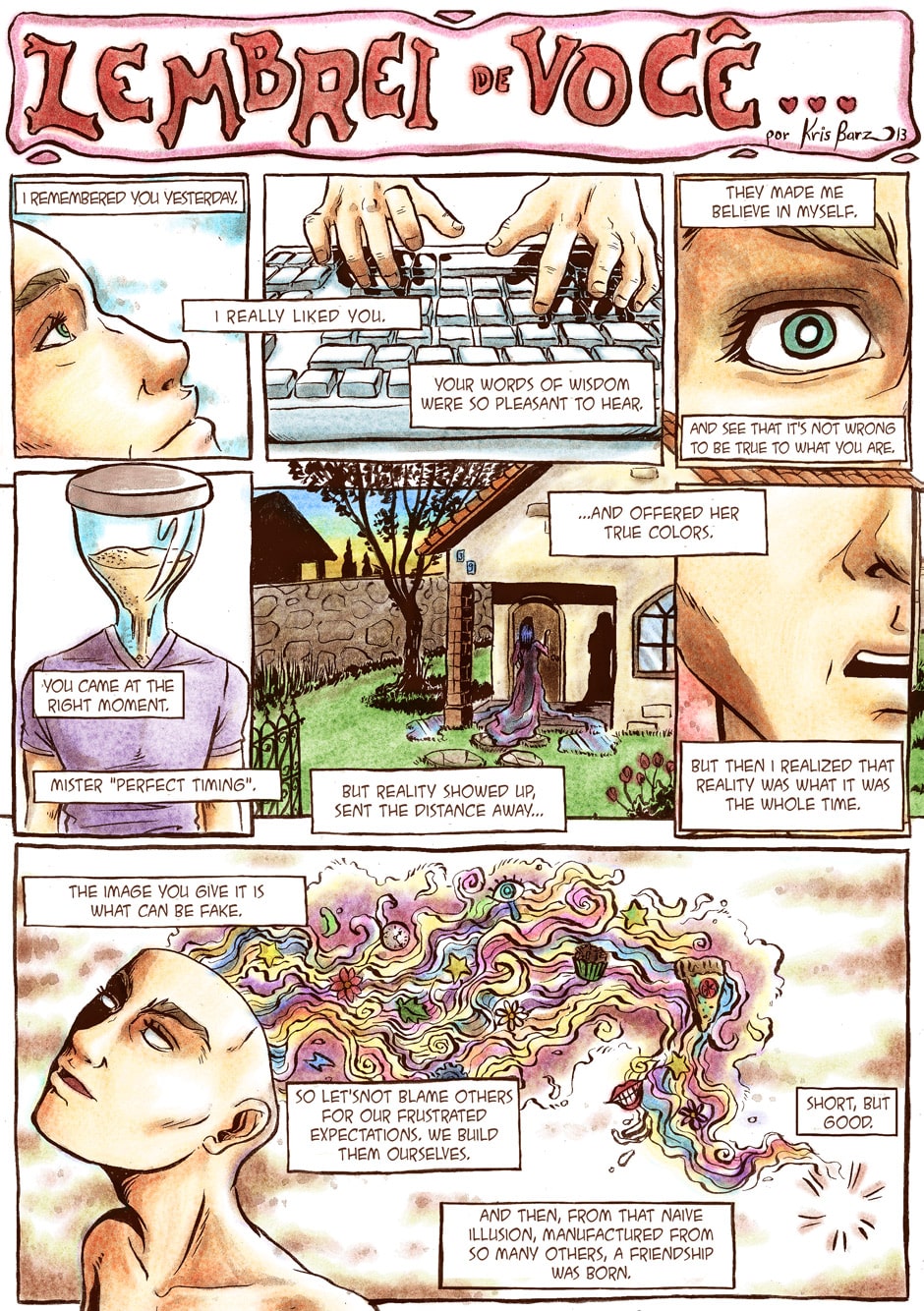 We all struggle with love and everything related to it. Each person has a different concept of what love is and a lot of times the suffering we put ourselves in is caused by what we expect love to be. "I remembered you" (from Portuguese "Lembrei de você") is a series of one-page stories from a very introspective week back in 2013. I was feeling a little hopeless and frustrated after years of problematic, unresolved or failed relationships. So I started remembering each and every person I had loved or been in love with (masochist much?) and started writing what came to my mind. I soon noticed that was my way of doing therapy, realizing we can all learn with good and bad things and even be thankful for them.