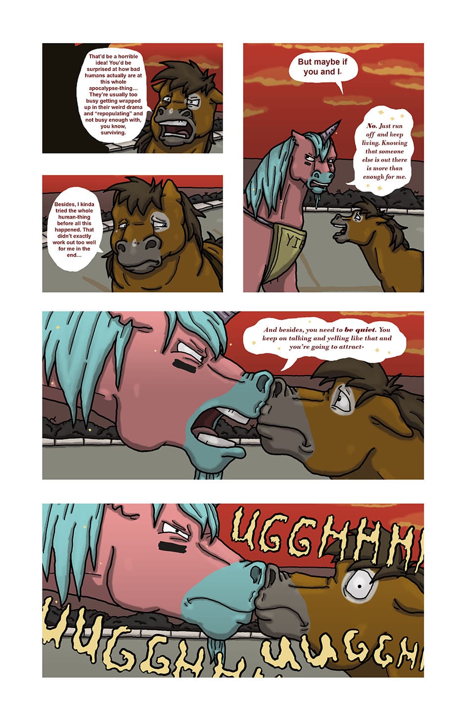 The heartwarming* tale of a unicorn fighting his way through the end of the world, fighting off zombies and making friends along the way. (*Note: This story is not heartwarming at all.) Updates every Saturday.