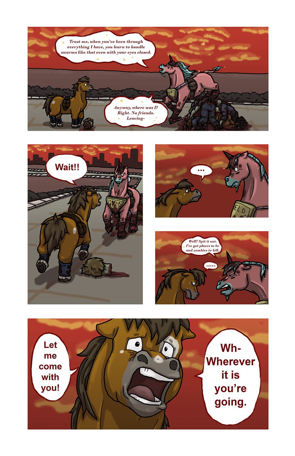 The heartwarming* tale of a unicorn fighting his way through the end of the world, fighting off zombies and making friends along the way. (*Note: This story is not heartwarming at all.) Updates every Saturday.