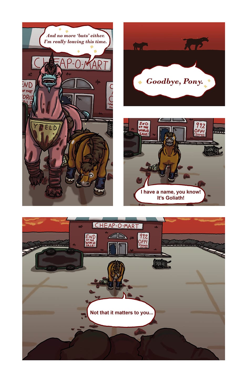 The heartwarming* tale of a unicorn fighting his way through the end of the world, fighting off zombies and making friends along the way. (*Note: This story is not heartwarming at all.) Updates every Saturday.
