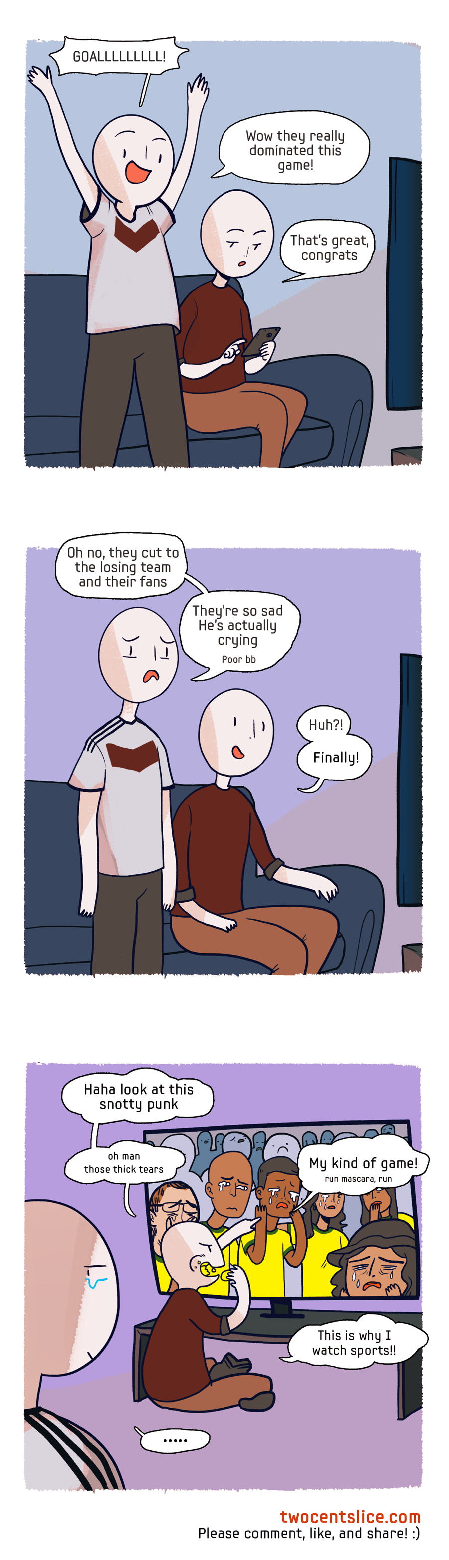 I am not really interested in this world cup, but if I read my facebook comments after the game, I get the feeling, most of the people didn't want to see an actual thrilling game, but rather the humiliation of the enemy by "your" team, since all they posted were pictures about brasil getting stomped or their fans being mocked over their sadness.