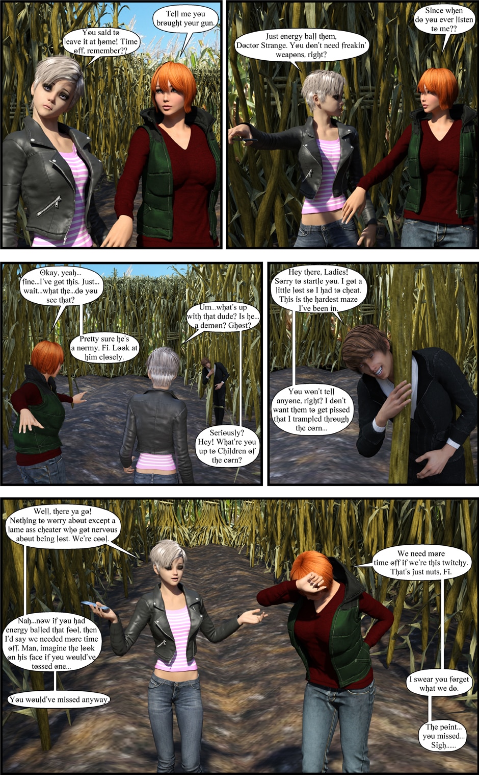 My second Corn Maze comic, covering the 'scary' part of the last comic. Covering how the characters are a bit overworked (or at least, too bound up in their jobs) was fun. Plus, making the corn maze itself was awesome. I'm glad I got 2 uses out of it.