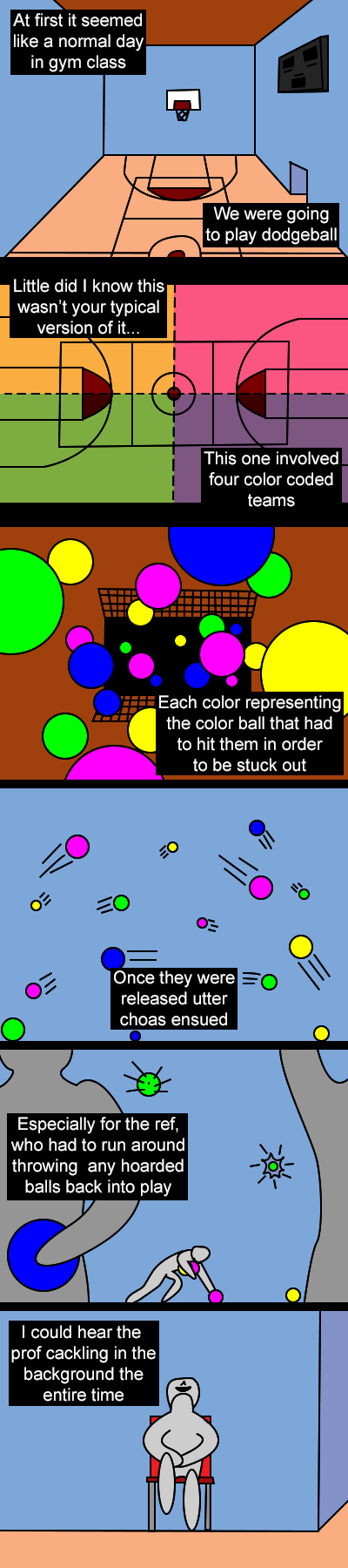 For those who don't know, normal dodgeball is a game where two teams throw balls at each other from their designated zones and if you're hit or go into the opposing team's zone your out! At least that's what it was for me...