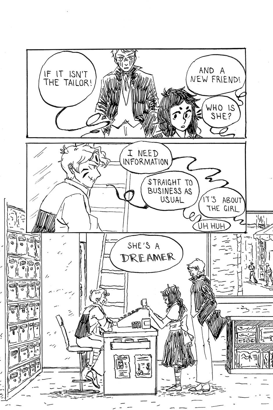 In which the Tailor introduces a new friend to an old questionable friend, Andrea sees something interesting, and conversation isn't directed at her.