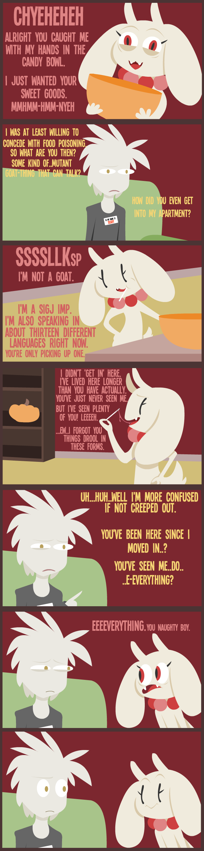 Now that you've been prepped for a scary mood, i can properly announce this October project. It's spooky month and that means a spooky story with way spooky things going on! such as super natural forces entering one man's apartment! ooOOOooo~ Something about death and the demonic! ooOOoOOoooOO~ And a halloween/birthday party that no one attends. DepreeeeEsssSSSsssing! So join me for the last of Halloween month with my comic, The Sigj!
