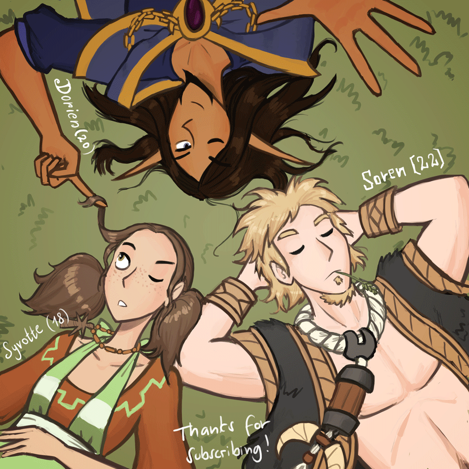 I will probably need to take a longer break after this one (I wanted to make it better but I ran out of time basically and I'm still sick) The next chapter will focus back on the bathhouse, with Karoleena. Thank you so much for subscribing and reading my comic, we're not even starting! :D