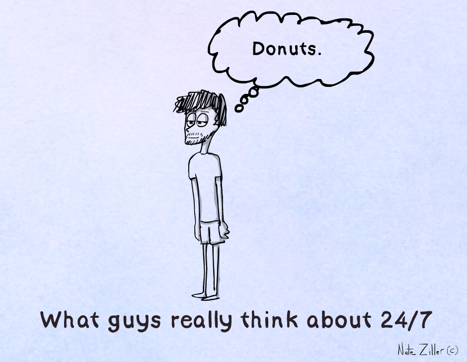 I've read that guys think about sex every 7 seconds. Nope. We think about donuts. Only donuts. And girls think about donuts too! Just as much as guys do! Everybody loves donuts! I really want a donut right now.