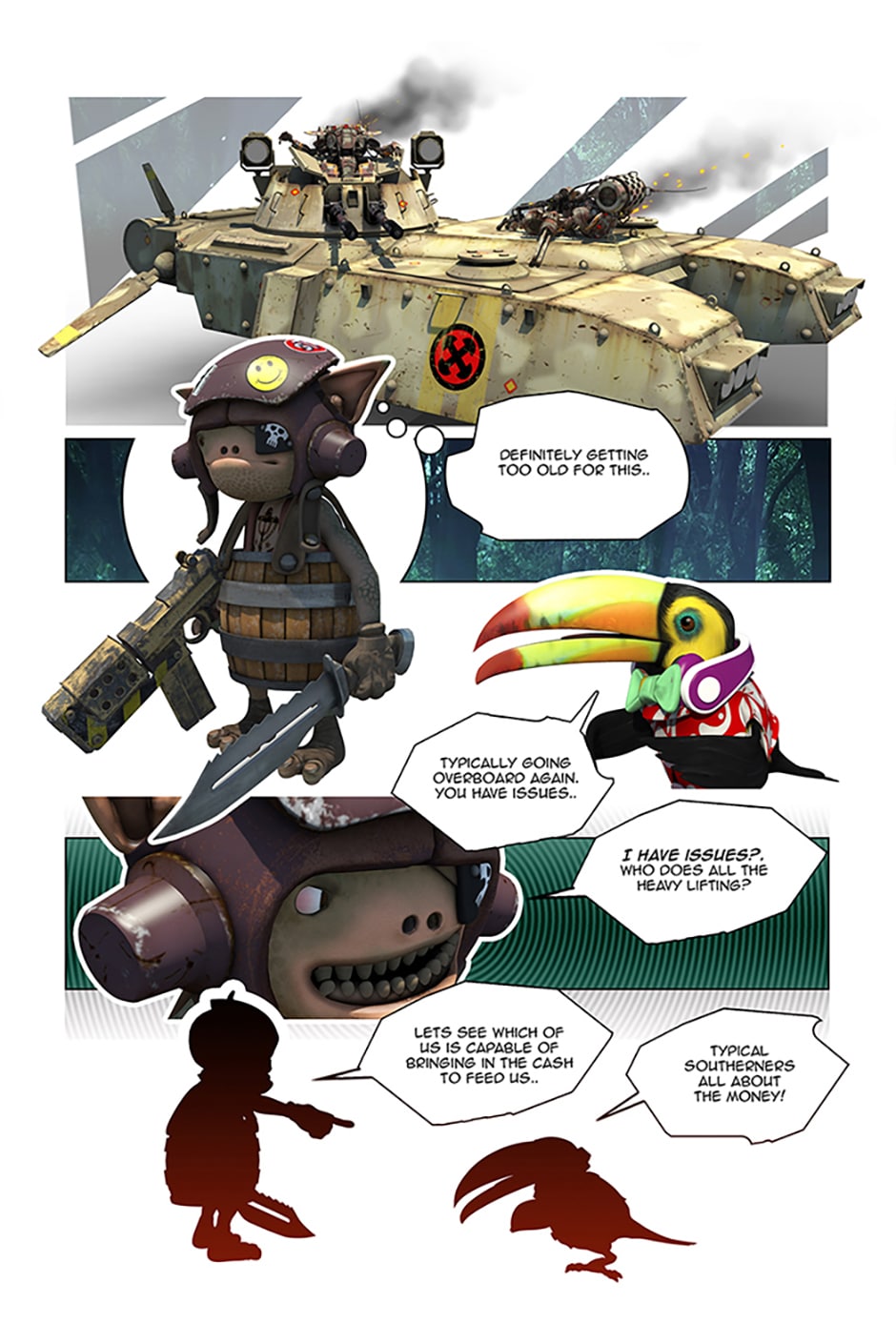 Our most savage but loved characters, Stambo, Trakk and Big Tom scratch a living in the swamps of Tangalang Forest. Hunted buy the Boonroids their clever skills of banter keeps them going.