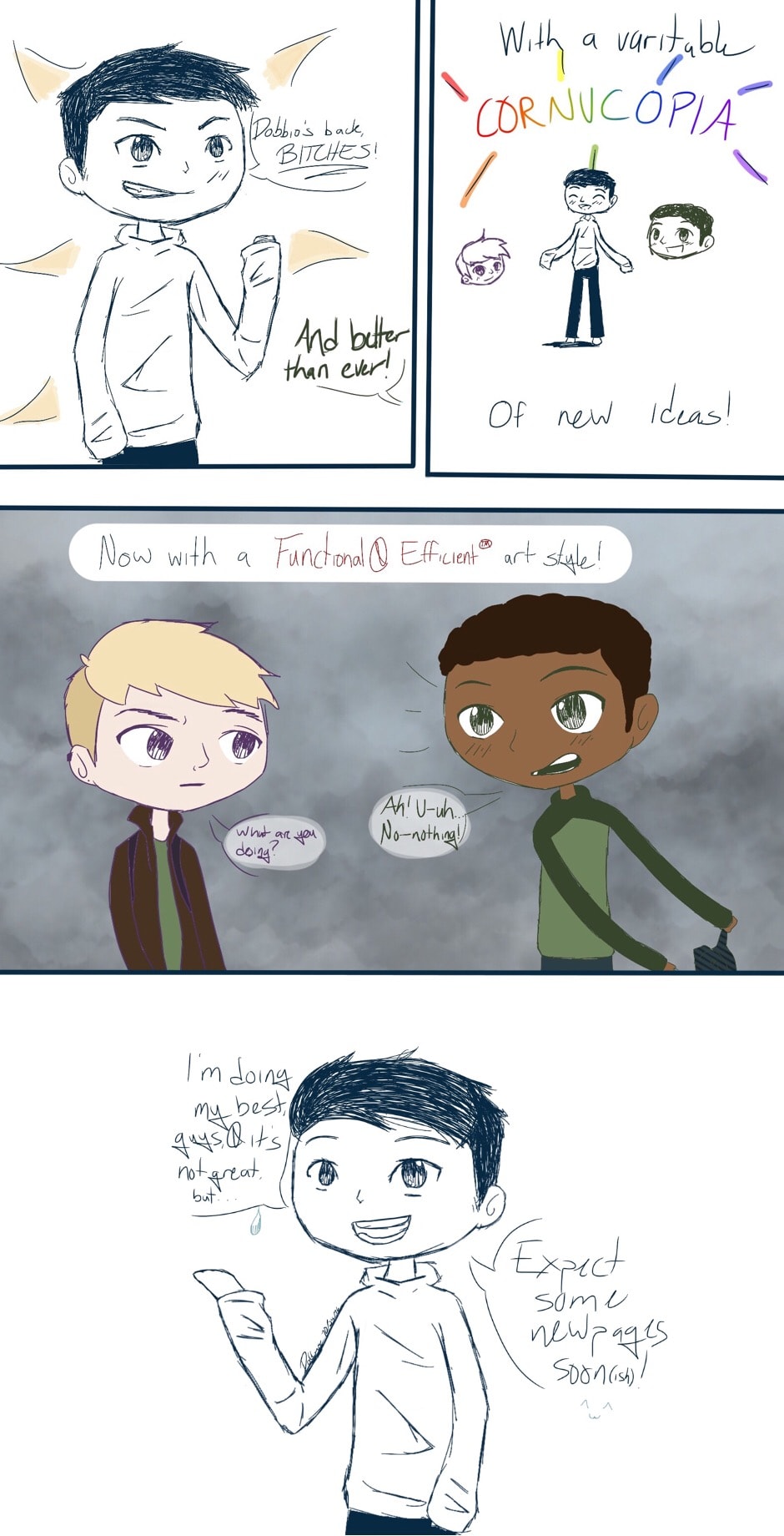 I'll have a new update by maybe the end of the week? Sorry it's been really hectic and I have bad creative timing, but I am back. My cowriter might also be back but he's in college so it's debatable. Sorry to be gone so long!