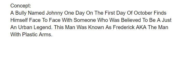Now this concept I had for awhile. I created Fredrick after hearing a story one of my teachers told the class. It was basically a story about a nightmare. She saw a tall man with a black hat that was so big that it covered most of his face. And he had plastic arms. Often the plastic man would strangle her with his cold plastic hands. Now this dream was a dream that she had for awhile until she found a way to stop having it.