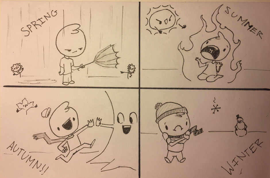 Spring: https://www.youtube.com/watch?v=AyAWaf0IngU Summer: https://www.youtube.com/watch?v=EVsBYFlzCAg Autumn: https://www.youtube.com/watch?v=T51nmyCODHQ Winter: https://www.youtube.com/watch?v=N-aK6JnyFmk (Maybe...)