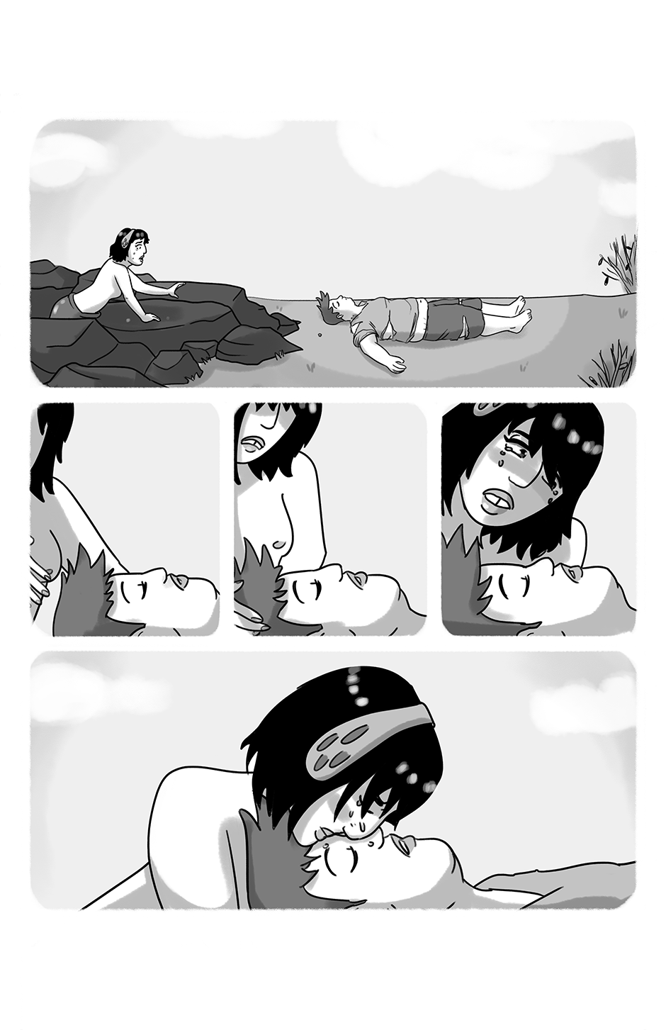 Page 15 Image description: Four panels. Top and bottom panels are long horizontal panels. Middle three panels are short and small. First panel: the mermaid gets out of water toward the laying human. Panel 2: the mermaid is crying and leaning over the human. Panel 3: the mermaid is leaning closer. Panel 4: and closer. Panel 5 on bottom: the mermaid kisses the human's forehead.