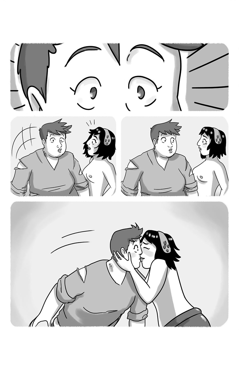 Page 16 Image description: Four panels. Top first panel is narrow and horizontal. Middle two panels are short. Bottom last panel is big. First panel: a close up. The human has woken! Panel 2: the human sits up in a daze. The mermaid is surprised. Panel 3: both sat and stare at each other in a silent daze. Panel 4: the mermaid grabs the human and kisses them on lips.
