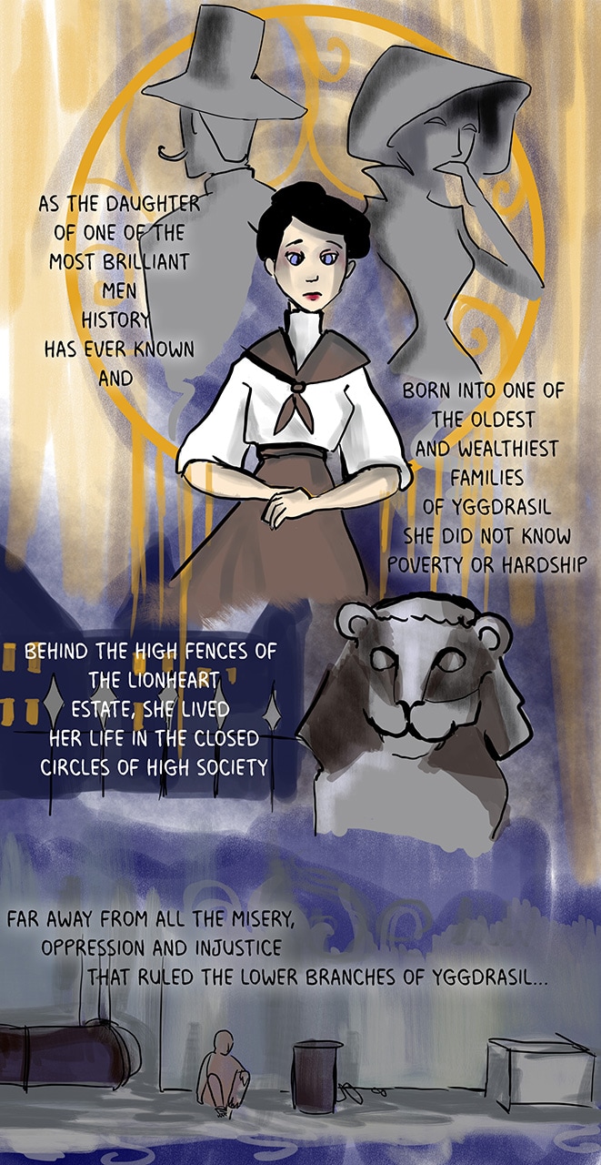Eivor is a young lady, who lives in an attic. Her silent companion is a huge black wolf, that comes and goes as he pleases, but allways returns to her. In a world, where humanity has left earth to live in the branches of Yggdrasil, the two beginn a dangerous journey with unknown end...