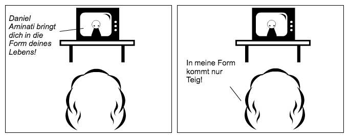 This is the original "Shape of your life!" comic. It sadly didn't make a lot of sense in English so I changed it a bit. For those who are interested in the meaning of the original joke: We have this exercise boot camp commercial. This dude, Daniel Aminati, promises to "get you in the shape of your life". "Shape" means "Form" in German. We also use the word "Form" when we talk about baking dishes. You put dough in a "(Back-)Form". The text on the right says: "The only thing that gets in my shape (in the sense of 'my baking dish') is dough."