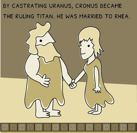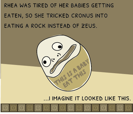 when zeus grew up, he and Gaia(Rhea's other name) gave Cronos a potion of wine and mustard to make him barf up the other gods- literally