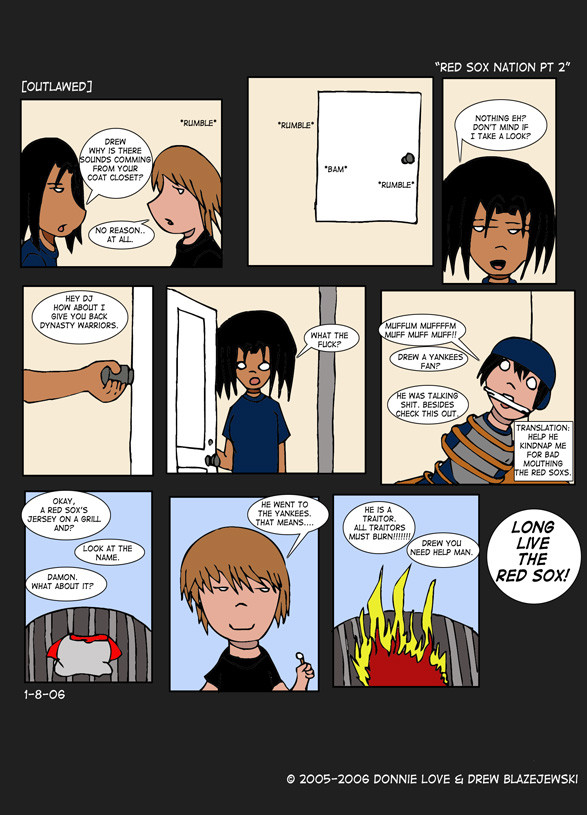 [Outlawed] is the story and events of DJ, who longs to be a web comic artist(or an artist in anything for that matter). He lives in Waldorf, Maryland and it is not exactly the best place to try to get his talent showcased. So DJ has to enlist the help of his friends,who share common ideals but in truth they are only there for the video games and free gear. Even still, DJ has to face the drama and the crap that is thrown at him daily but with video games and heavy metal music there's no telling what will happen to DJ and his friends.