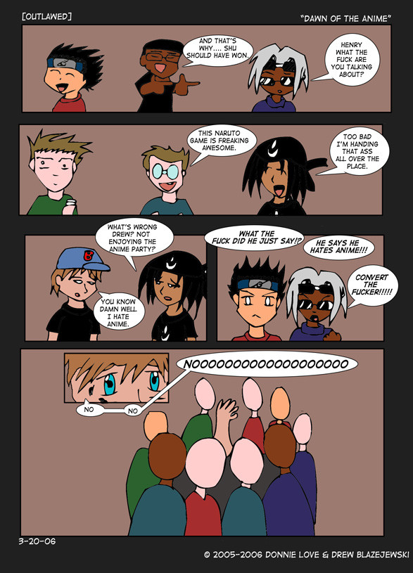 [Outlawed] is the story and events of DJ, who longs to be a web comic artist(or an artist in anything for that matter). He lives in Waldorf, Maryland and it is not exactly the best place to try to get his talent showcased. So DJ has to enlist the help of his friends,who share common ideals but in truth they are only there for the video games and free gear. Even still, DJ has to face the drama and the crap that is thrown at him daily but with video games and heavy metal music there's no telling what will happen to DJ and his friends.