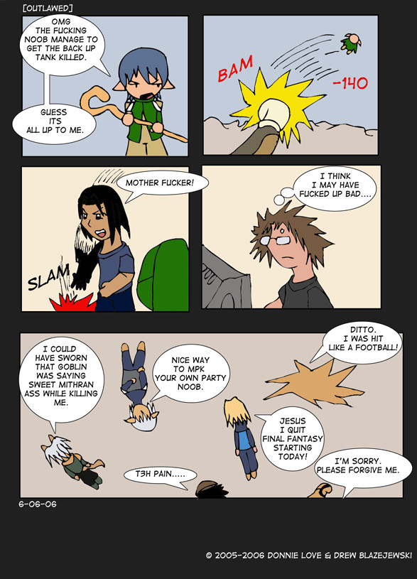 [Outlawed] is the story and events of DJ, who longs to be a web comic artist(or an artist in anything for that matter). He lives in Waldorf, Maryland and it is not exactly the best place to try to get his talent showcased. So DJ has to enlist the help of his friends,who share common ideals but in truth they are only there for the video games and free gear. Even still, DJ has to face the drama and the crap that is thrown at him daily but with video games and heavy metal music there's no telling what will happen to DJ and his friends.