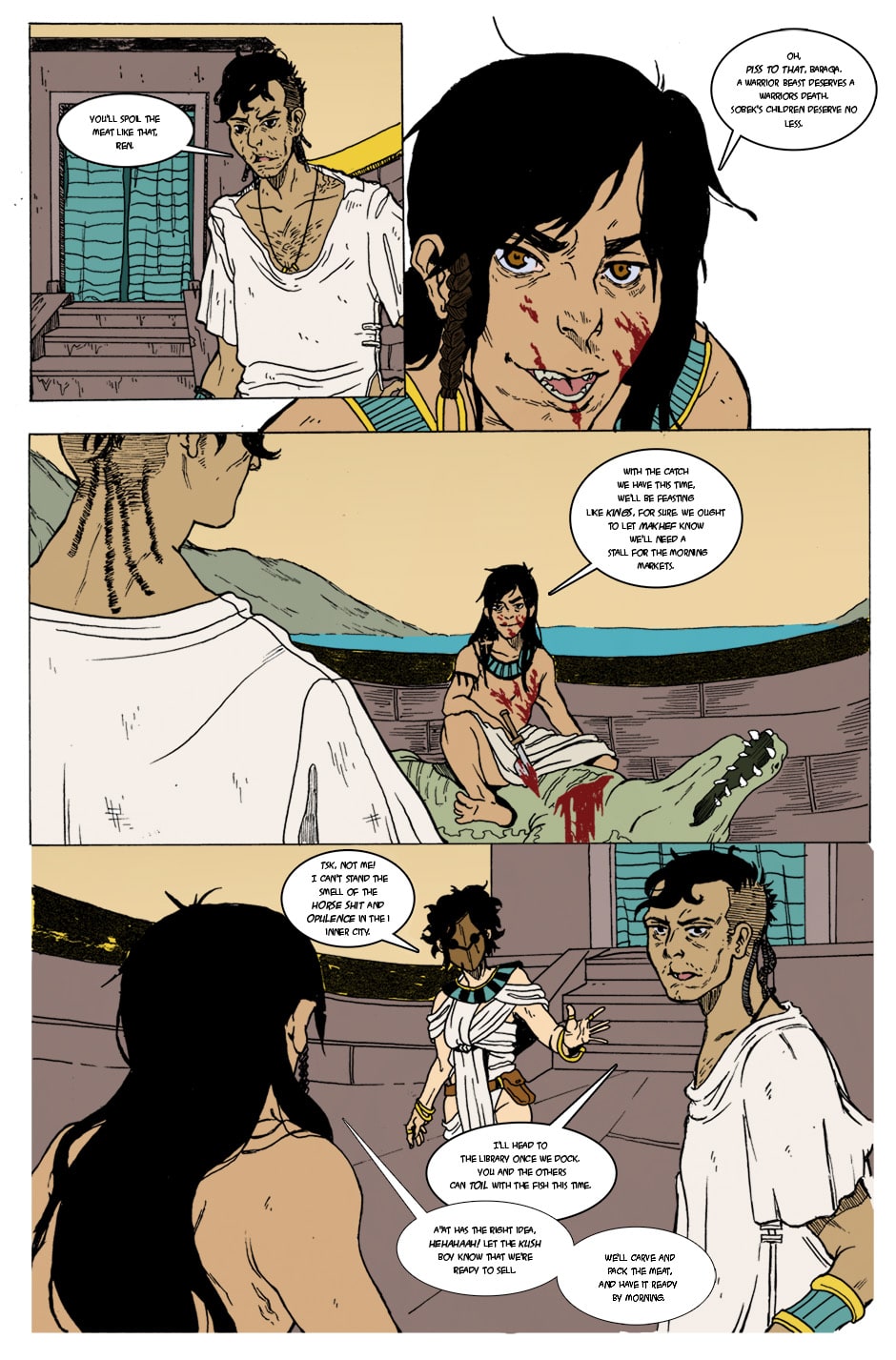 Sunpiercer takes place in Ancient Egypt, in the city of Waset (known today as Thebes). Set in the very beginning of Tutankhamen's reign as Pharaoh, Sunpiercer follows the crew of a fishing barge named "Sunpiercer". The fishermen of the barge are simple people, closely associated to a small Cult of Sobek just outside the city gates, but are drawn into political intrigue - and what will become a battle for their lives, as they are tasked to secretly retrieve an “artifact of the Gods” from a dangerous councilor of Tutankhamun’s father, the shamed Akhenaten. Unfortunately for our crew, they have very little idea of what exactly they’ve gotten themselves into.