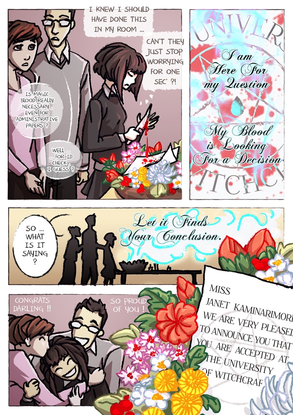 Janet is a witch. She is about to enter in the prestigious University of Witchcraft to become an Elite Witch. Hantise is Janet's Sheitan. Or maybe Janet is his witch. Anyway, they are supposed to do great sorcery things together... about Life and Death, since it is their speciality c(o)urses.