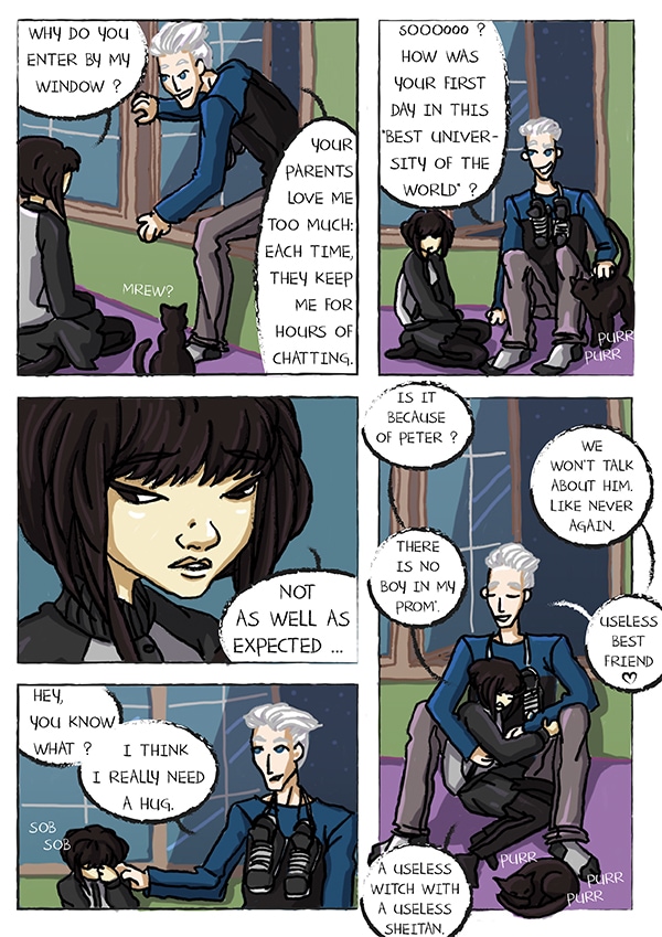 Janet is a witch. She is about to enter in the prestigious University of Witchcraft to become an Elite Witch. Hantise is Janet's Sheitan. Or maybe Janet is his witch. Anyway, they are supposed to do great sorcery things together... about Life and Death, since it is their speciality c(o)urses.