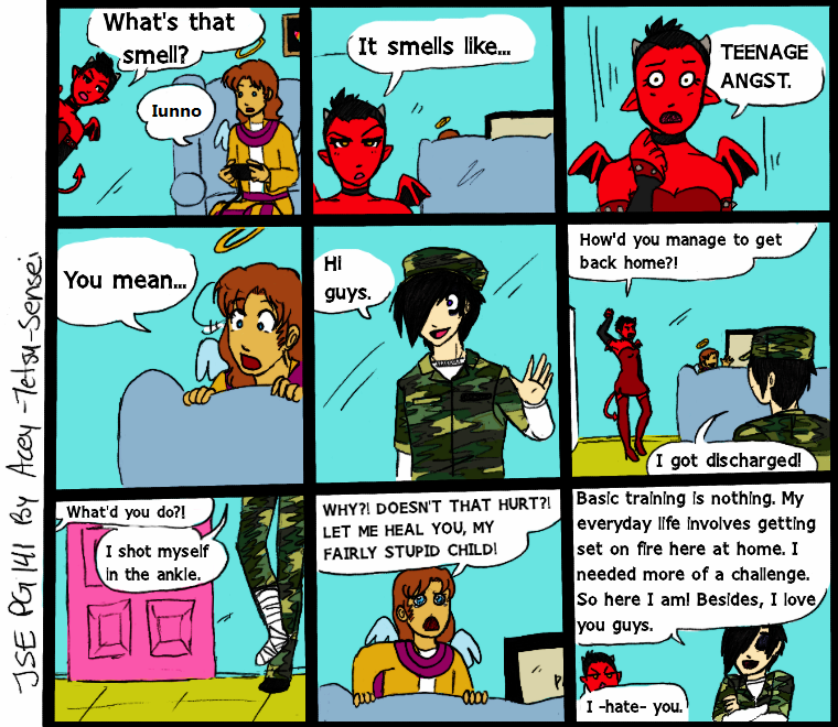 **a few pages before 139, Satan had two army guys come to their house to drag Emo off to boot camp :)