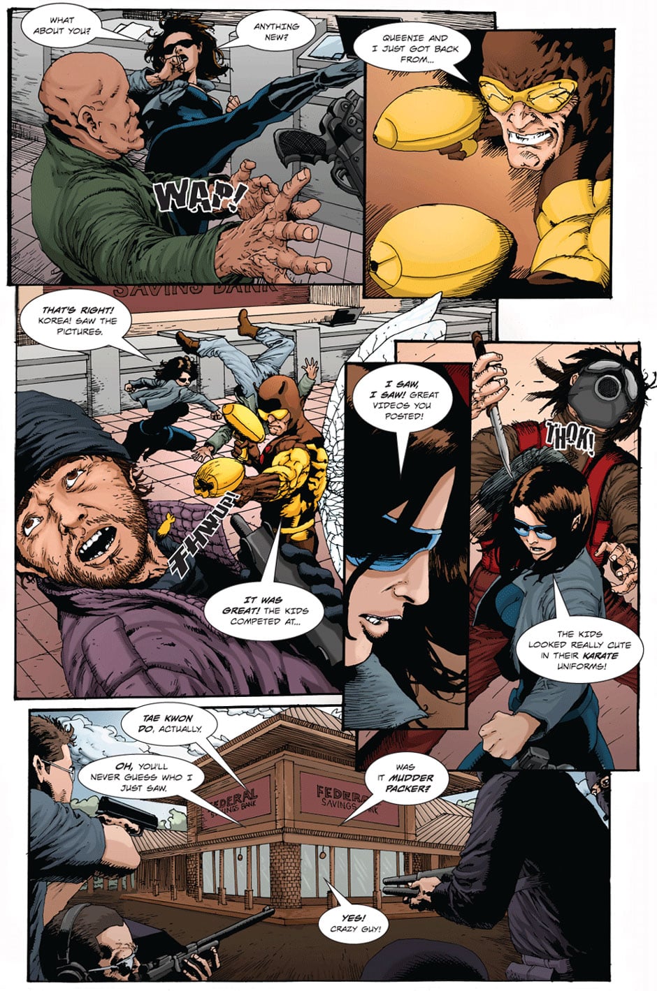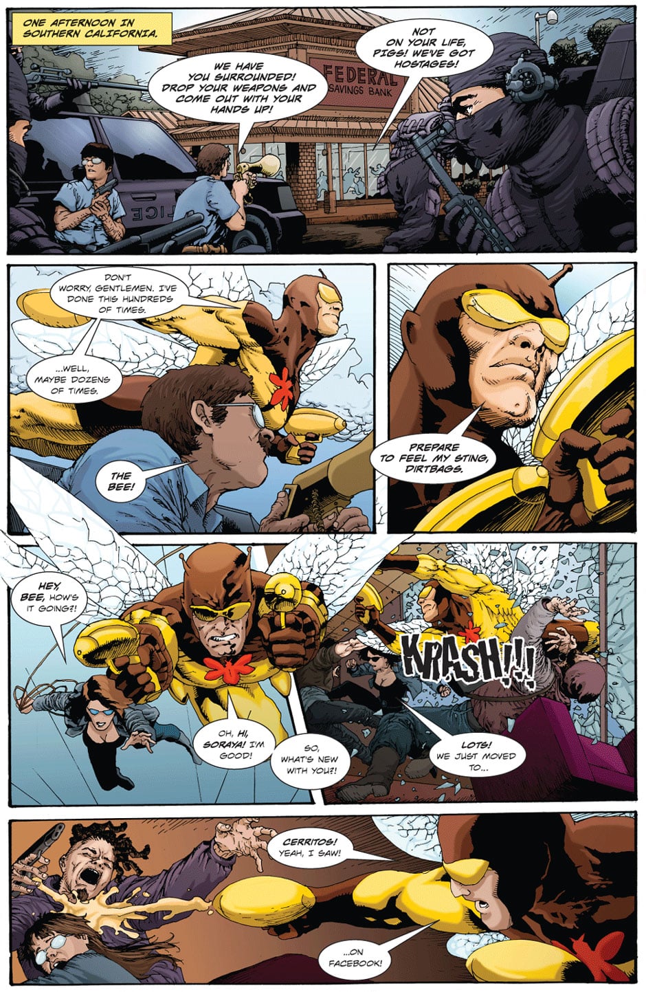 Two crimefighters catch up on their personal lives while foiling a bank robbery. Written by Ramon Gil. Illustrated by Roy Allan Martinez. Colors by Macarena Cortes.
