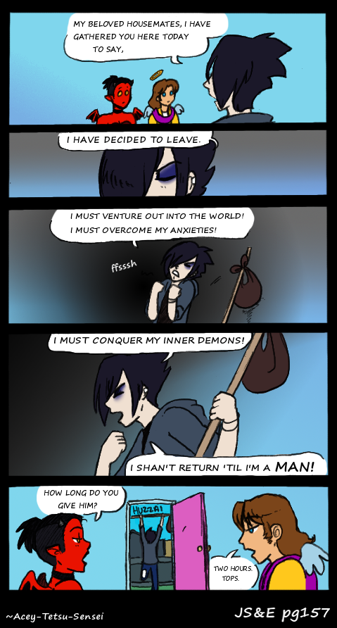 Drawing Emo's dramatic poses is still amusing. Also, it's not normal that I leave the speech bubble outlines in when I finish these... *shrug* oh well. Have I given Satan Sokka's hair before? ...Imighthave,woops. Feel free to suggest hairstyles for Satan. originally submitted to dA on: April 12, 2012