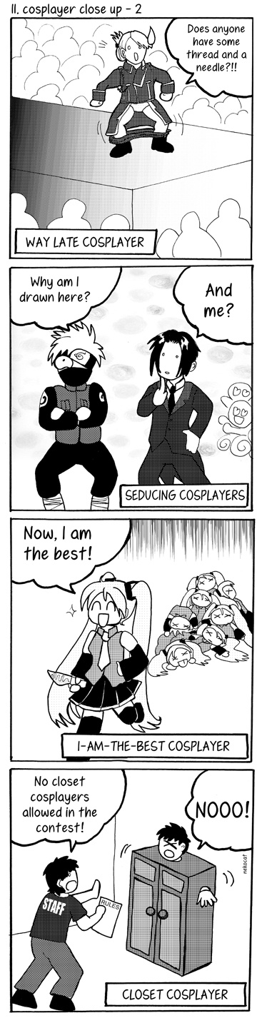 You like cosplay? You like mangas? Then you are welcome here to discover Yonkoma Cosplay! "Yonkoma" in japanese means gags in 4 frames or "comic strip". On board, 3 peoples : Plot = Akihabara Samourai; drawing = Nekocat; Translation in english from french = Roccujo.
