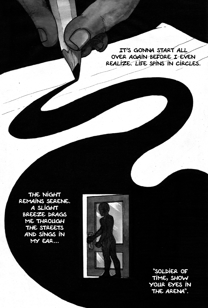 It's gonna start all over again before I even realize. Life spins in circles. The night remains serene. A slight breeze drags me through the streets and sings in my ear... "Soldier of time, show your eyes in the arena".