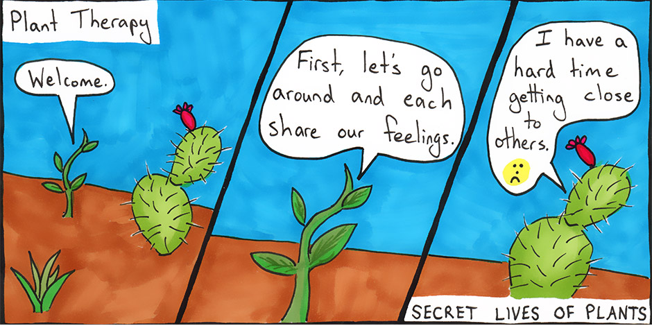 To be a cactus and in search of a hug? Time for therapy. View this comic on @ThePlumGrove blog at: https://theplumgrove.com/2017/01/secretlivesofplants-02-therapy/