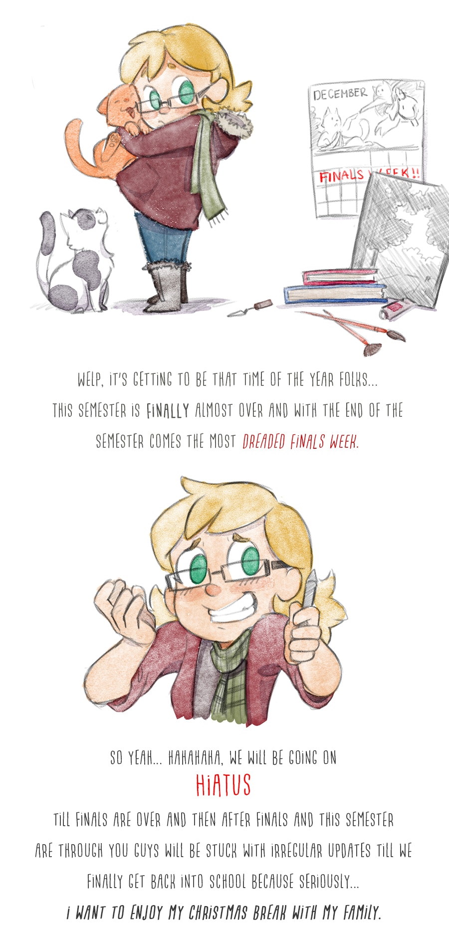QuQ I love drawing these comics... I love my roommates! I'll miss Sam, she's gonna be home for winter semester but will be with us again in the Spring! or at least me. Tank wants to go hooome! AAAAAH! I want to keep these two cinnamon rolls forever...