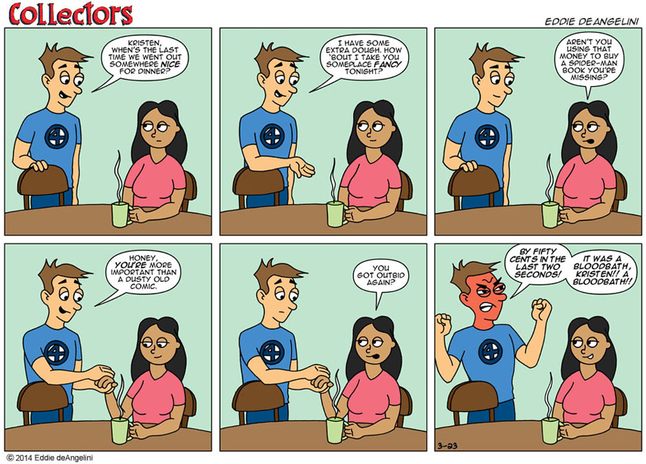 The love story of a husband, a wife and a comic book collection. Collectors is a sunday-style color comic strip about Eddie, a comic book collector who loves his wife and his comic collection...but not always in that order!