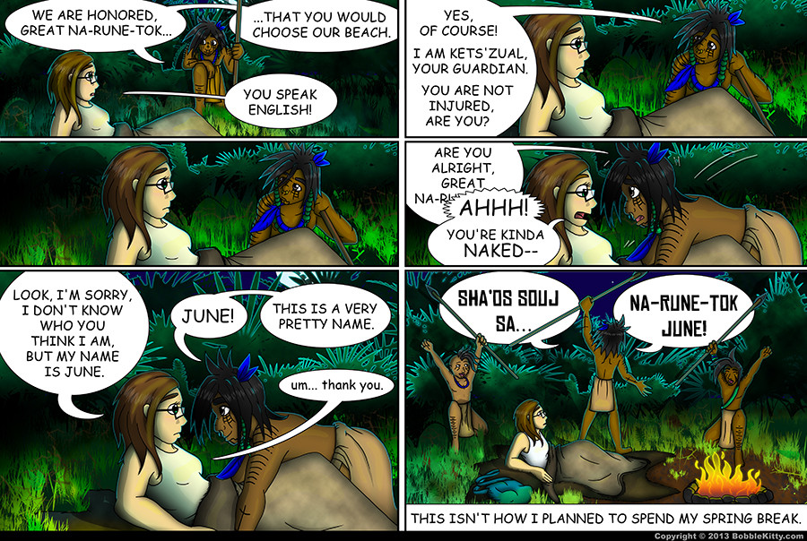 This quest-driven story follows June as she makes the trek to the center of the island, in search of the City of the Na-Rune-Tok, where others like her are said to live. Along the way, she finds sprawling island landscapes, all manner of magical beasts, friends, foes, and an awful lot of tattooed people in loincloths.