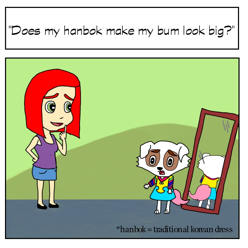 Panda is Korean, and a lot of Korean dogs will often wear outfits, and have their fur dyed (hence Panda's pink tail).