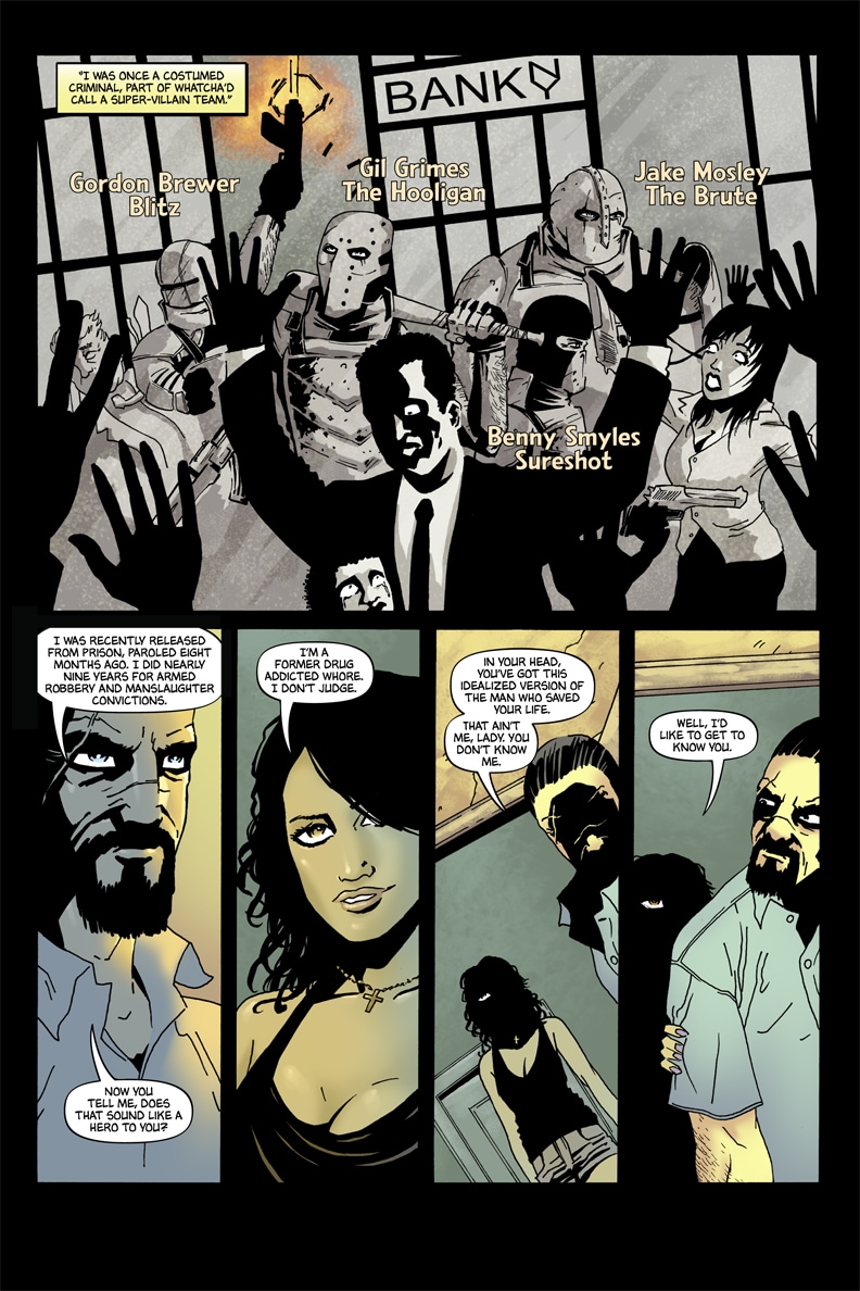 Gil Grimes, a former costumed criminal, was fresh out of prison and trying to stay on the right side of the law when he reluctantly saved a heroin addicted prostitute being brutally attacked outside his apartment.