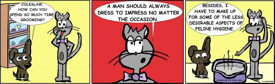 Doghouse In Your Soul is a comic strip featuring the animals of a small pet shop. The two main characters: Meshack, the sarcastic skunk, and Chimney, the sweet and lovable chihuahua, exemplify the contrasting styles of humor in this comic. Other main characters such as Spikes, the energetic hedgehog, and Soupy, the oft-frightened turtle, will cause all kinds of problems for Mr. Frump, the cantankerous parrot, and Alaska, the crab who fancies himself a king. Rounding out the usual gang is Coleslaw, the fashion-forward feline. Pop references will be plentiful, mixing a little bite with a lot of heart.