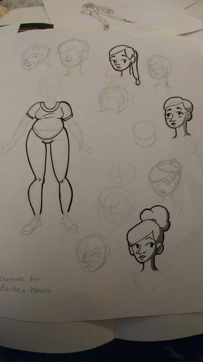 I was digging around in my old sketch book and I found some old drawings of Eartha back when I was still trying to figure out an hair style for her.