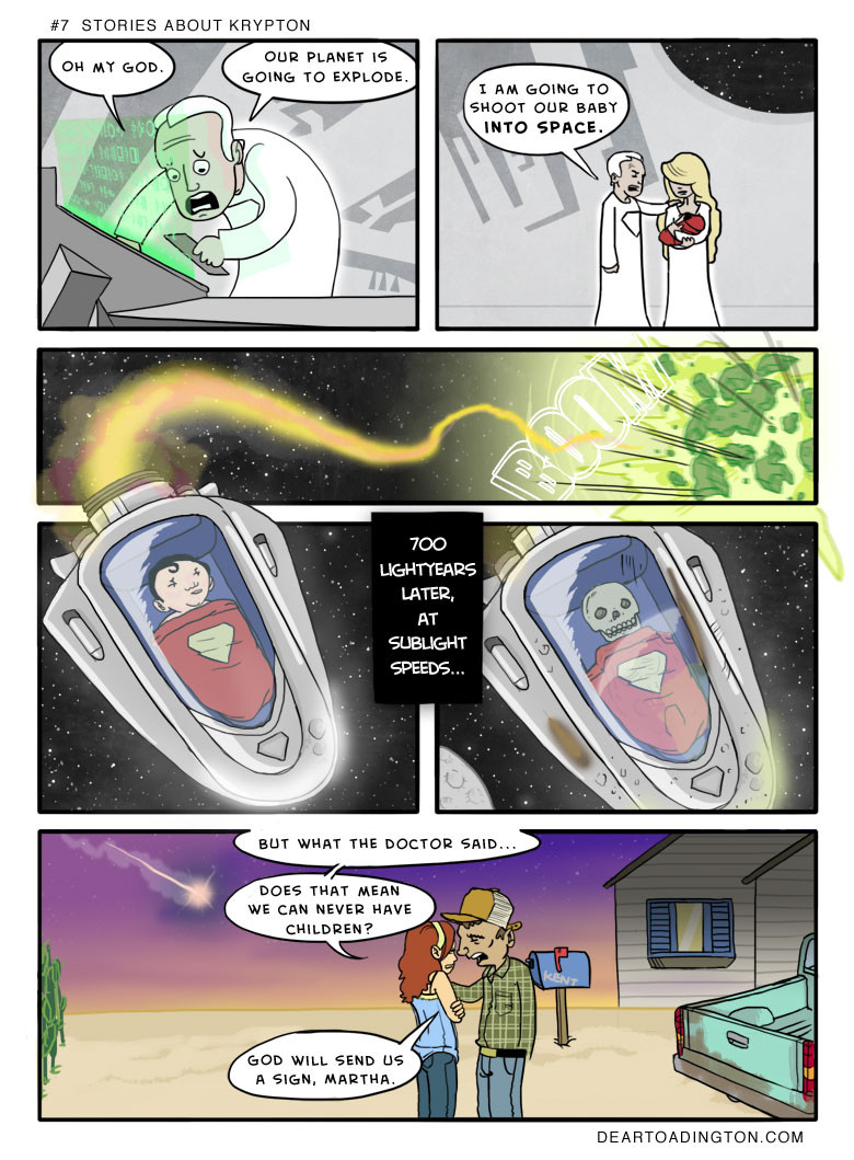 “Hey guys the moral this week is stop shooting babies into space, ok? Really try and stop it.” - James “Drawing this comic really made me want to draw one that actually features a superhero. One day!” - Jeff