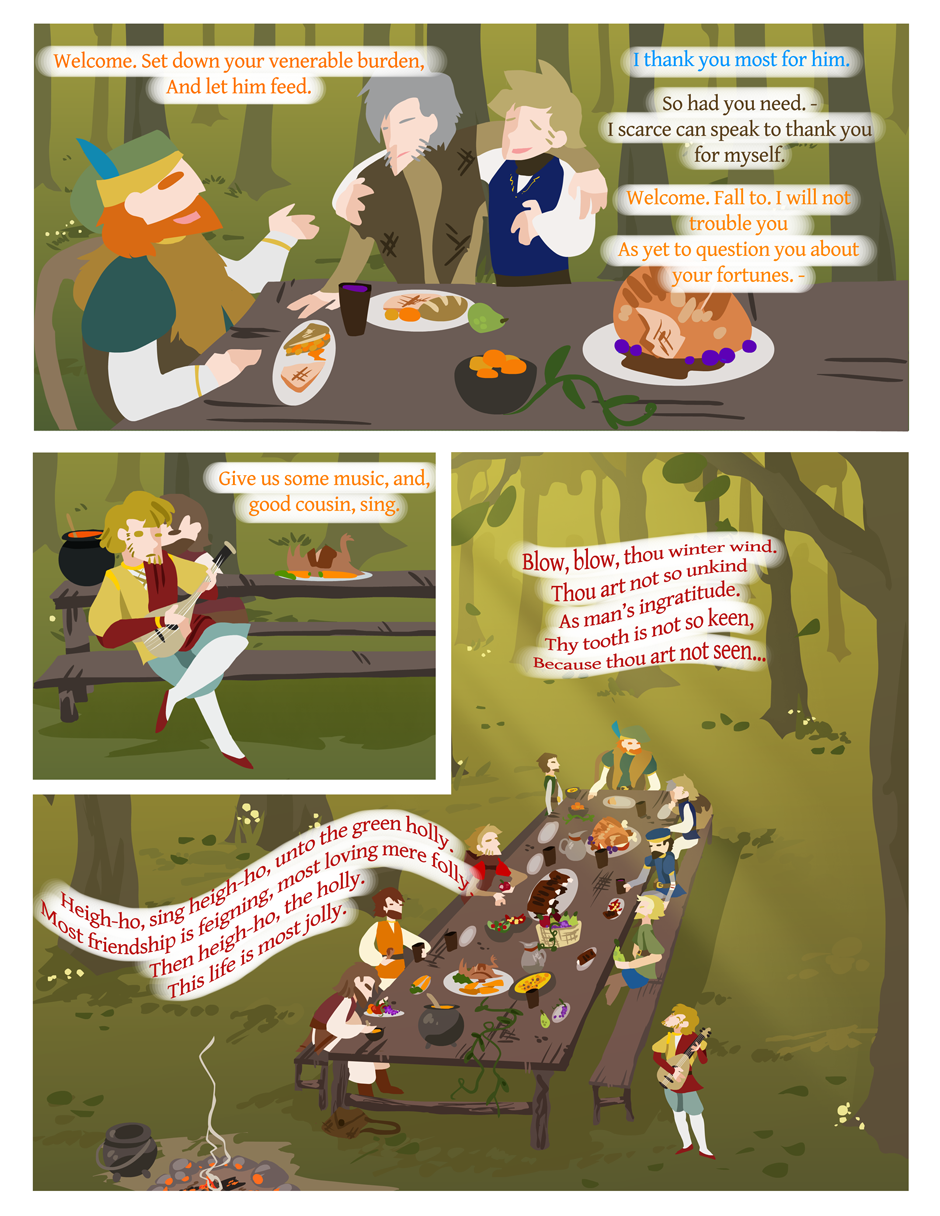 This was for a school project last year. A short segment of Shakespeare's comedy, As You Like It, has been drawn by me. The formatting is weird because it was to be printed on 11 x 8.5 paper... Enjoy it anyways? owob P.S. The jokes are obscure and old-timey!!!