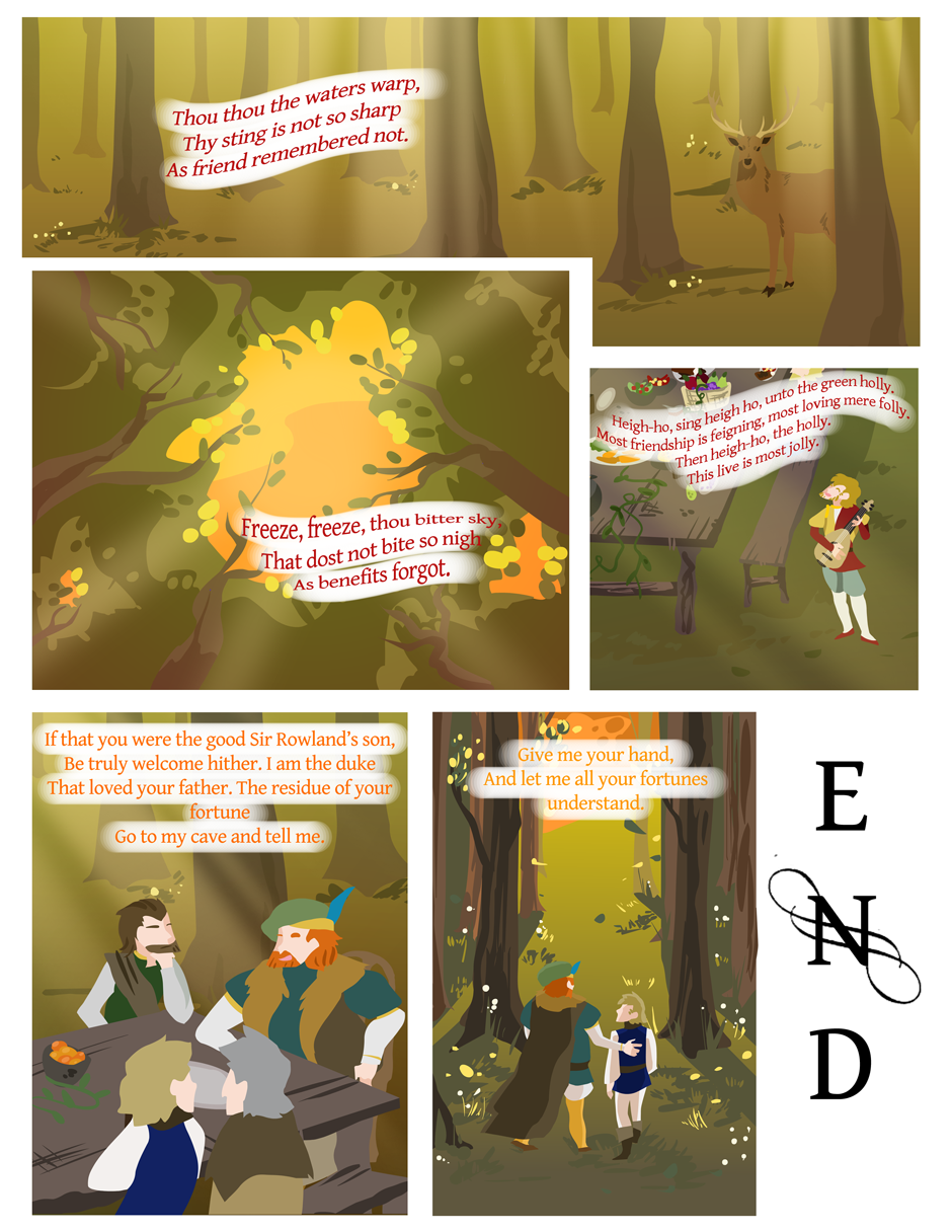 This was for a school project last year. A short segment of Shakespeare's comedy, As You Like It, has been drawn by me. The formatting is weird because it was to be printed on 11 x 8.5 paper... Enjoy it anyways? owob P.S. The jokes are obscure and old-timey!!!