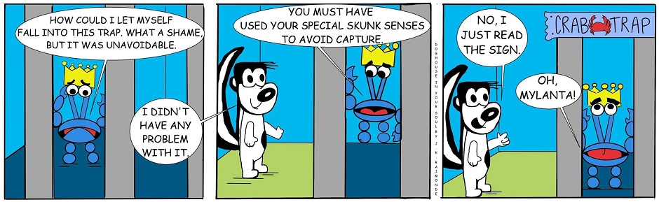 Doghouse In Your Soul is a comic strip featuring the animals of a small pet shop. The two main characters: Meshack, the sarcastic skunk, and Chimney, the sweet and lovable chihuahua, exemplify the contrasting styles of humor in this comic. Other main characters such as Spikes, the energetic hedgehog, and Soupy, the oft-frightened turtle, will cause all kinds of problems for Mr. Frump, the cantankerous parrot, and Alaska, the crab who fancies himself a king. Rounding out the usual gang is Coleslaw, the fashion-forward feline. Pop references will be plentiful, mixing a little bite with a lot of heart.