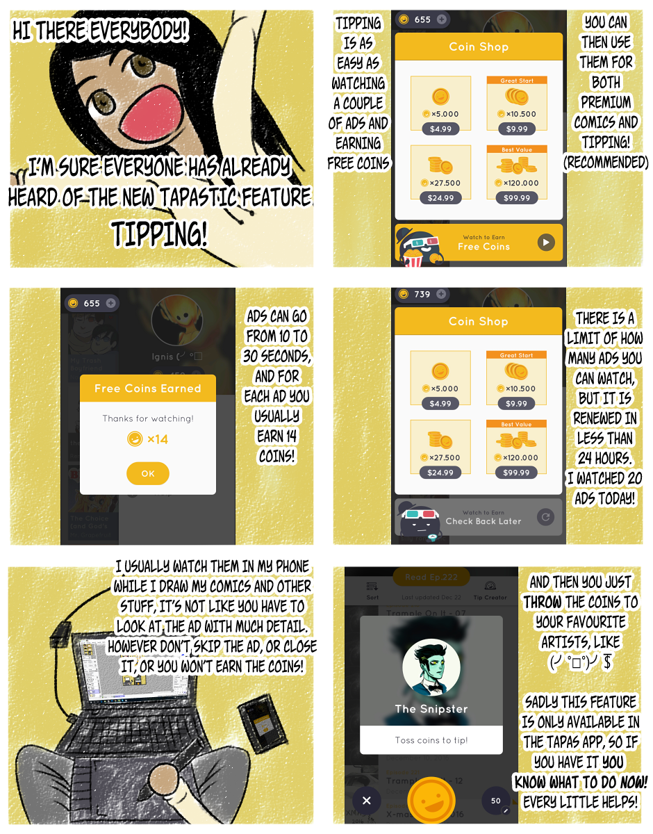 The only problem, of course is that it's only available for the app, but fret not! The Tapastic staff is already working on making everything (not only coins, but keys and stuff as well!) available for the desktop site, but they want to polish the app features, as it is easier to handle.